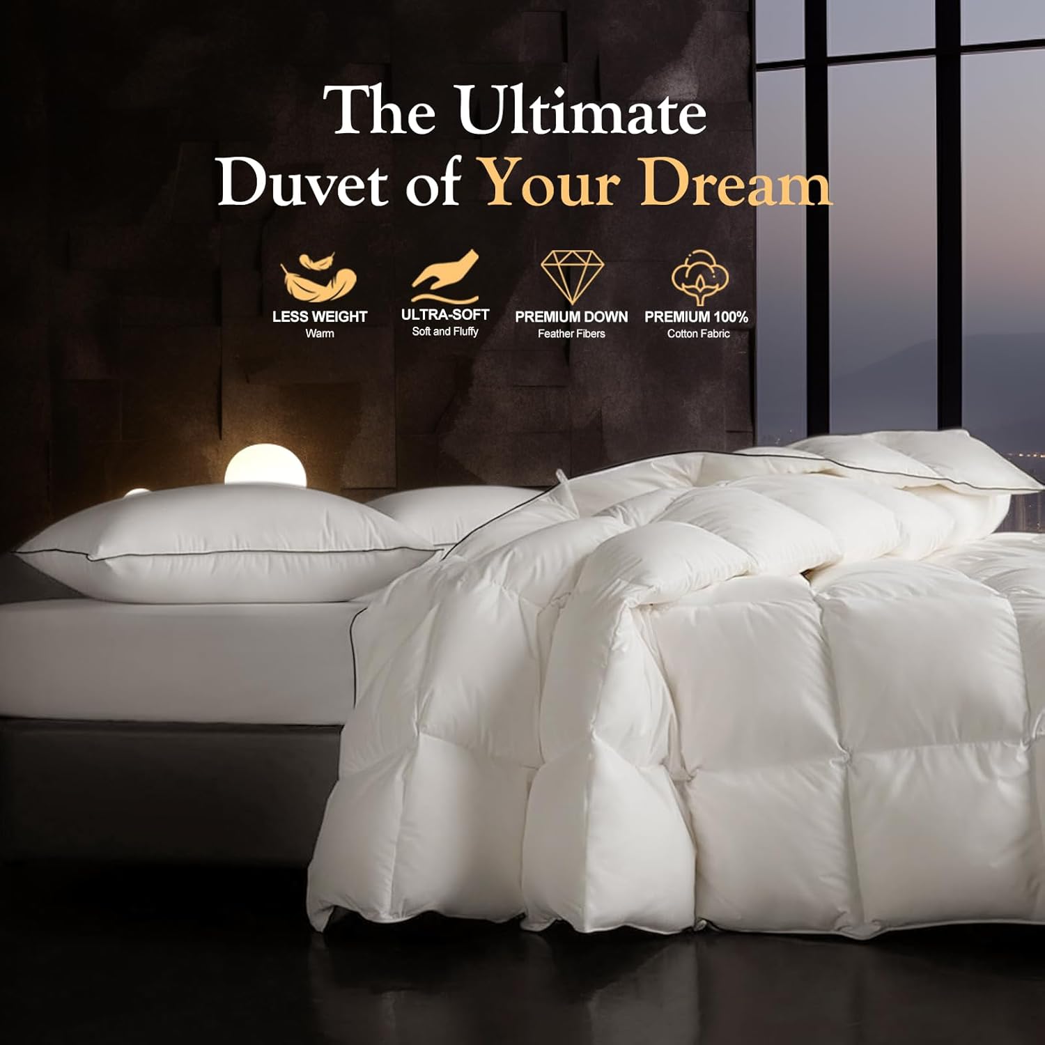 • Luxury Sleep Sanctuary: Indulge in our down fibers comforter with premium duvet insert, swathed with breathable stitching and satin-trimmed elegance. Dual-lock technology (4 straps + 4 buttons) fuses it to your duvet cover seamlessly — no slip, pure silent comfort. Nestled in lofty fibers, this fluffy comforter transforms your down duvet into a sanctuary of tranquility. Sleep like royalty